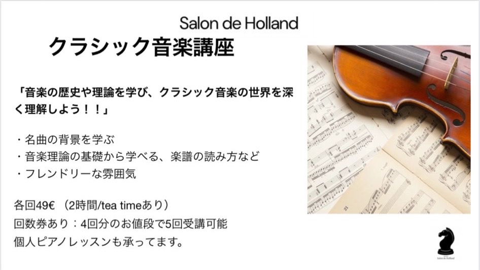 子供の頃に習ったピアノで挫折してから、クラッシック音楽とは無縁でしたが、聞くだけでも充分に深く楽しめる世界があることを知りました。このクラスでは、音楽のルーツや背景とヨーロッパの歴史を同時に学ぶことができて、早速アムステルダムのConcert Gebauwでオーケストラなどを味わいたいと思い、世界が広がって嬉しい!